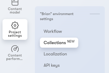 Getting started with Collections in Kontent it is pretty easy. As long as you have the feature available to your project (which is based on your Kontent subscription). For the rest of this post I am assuming that you have access to Collections in your subscription. You begin by logging into Kontent, then choose the project you are working on, and select the Project Settings main navigation menu item in the app. Once inside of Project Settings you click on the Collections. One optional step is to check which Environment you are using in your Kontent Project. It's best to create this first in a non production environment.